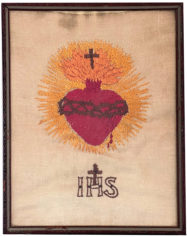 A gentler forgiveness is something we encourage each of us to practice towards ourselves as well as towards others. We were taught to follow Christ’s example, his way of love and forgiveness, but we don’t always succeed. Our hearts need their own protection. For many of us, a sentimental and satisfying holiday, like those depicted in the popular entertainments churned out this time of year isn’t a possibility. We all don’t puzzle into those greeting card sponsored configurations comfortably. Not all of us are welcomed home or find satisfactory resolutions to the conflicts that may plague us, nor do we experience the unconditional acceptance that we envision for ourselves. One of the Sacred Heart images we’re presenting in our installation is surrounded by twelve stars. Each star symbolizes a heavenly entity surrounding in union and protection the heart of Jesus. Among them are the Angels, the Powers, the Virtues, and the Saints. These twelve stars are champions and protectors, a guard of honour. We can surround ourselves with our own champions and protectors as well—our personal angels, our recognized saints, or our chosen family. To extend forgiveness and love to those who breach our boundaries and trigger our negative experiences can be an enormous challenge. To practice forgiveness and love towards ourselves can be equally challenging. When we don’t live up to our personal highest ideals, let us be gentle.